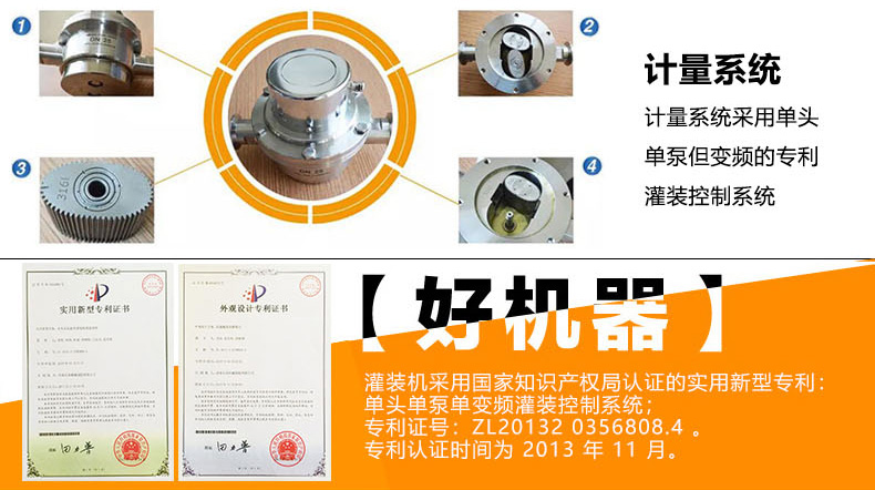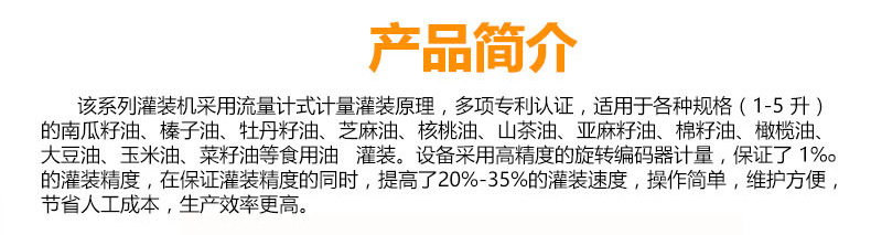 該系列灌裝機采用流量計式計量灌裝原理,多項認證,適用于各種規(guī)格(1-5升)的南瓜籽油、榛子油、牡丹籽油、芝麻油、核桃油、山茶油