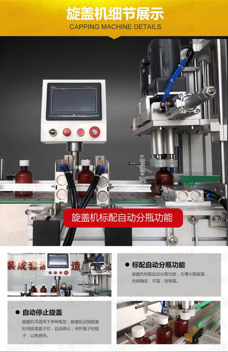 4、塑料瓶消毒水灌裝機 小玻璃瓶溶液灌裝機的旋蓋機部分可適用于多種瓶型,旋蓋輪達(dá)到旋蓋時間旋緊蓋子后,自動停止,保護(hù)蓋子和瓶子,以免損傷。