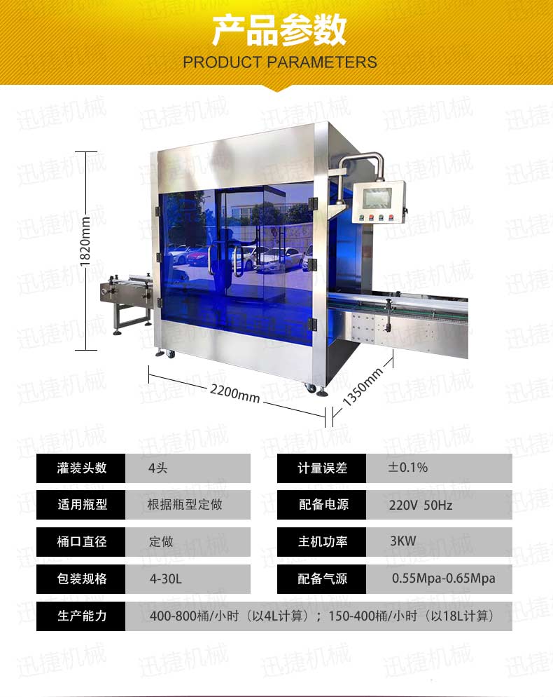 機(jī)油灌裝機(jī)適用于對4kg-25kg汽車用品類產(chǎn)品:潤滑油、防凍液、車用尿素等液體灌裝。自動(dòng)完成計(jì)數(shù)進(jìn)瓶、計(jì)重量灌裝、輸送出瓶等一系列操作。