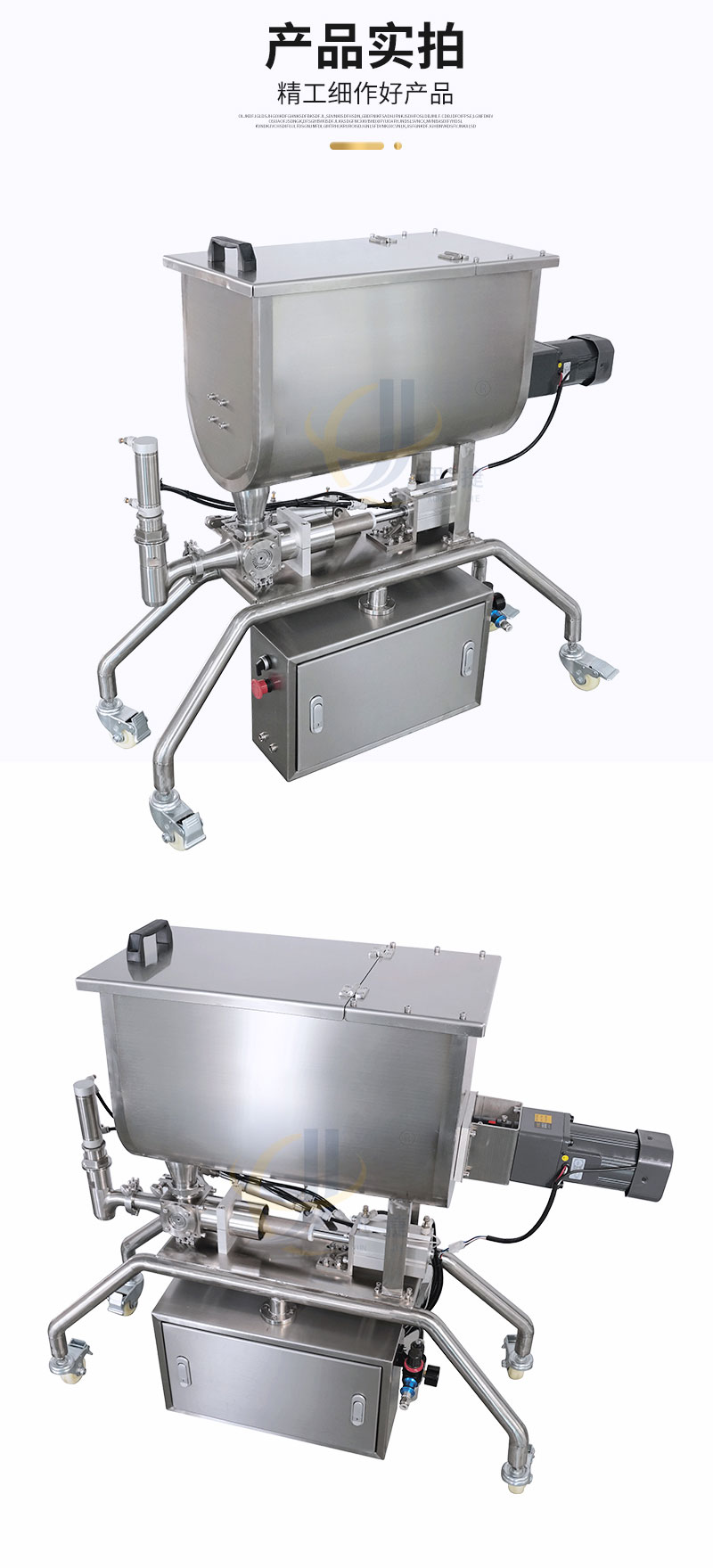半自動醬類灌裝機(jī)適合于將各類粘稠體及含有各種固體物質(zhì)如辣椒、花生、肉塊、佐料等物體的醬類和油、料分離的火鍋底料等灌裝于各種容器中