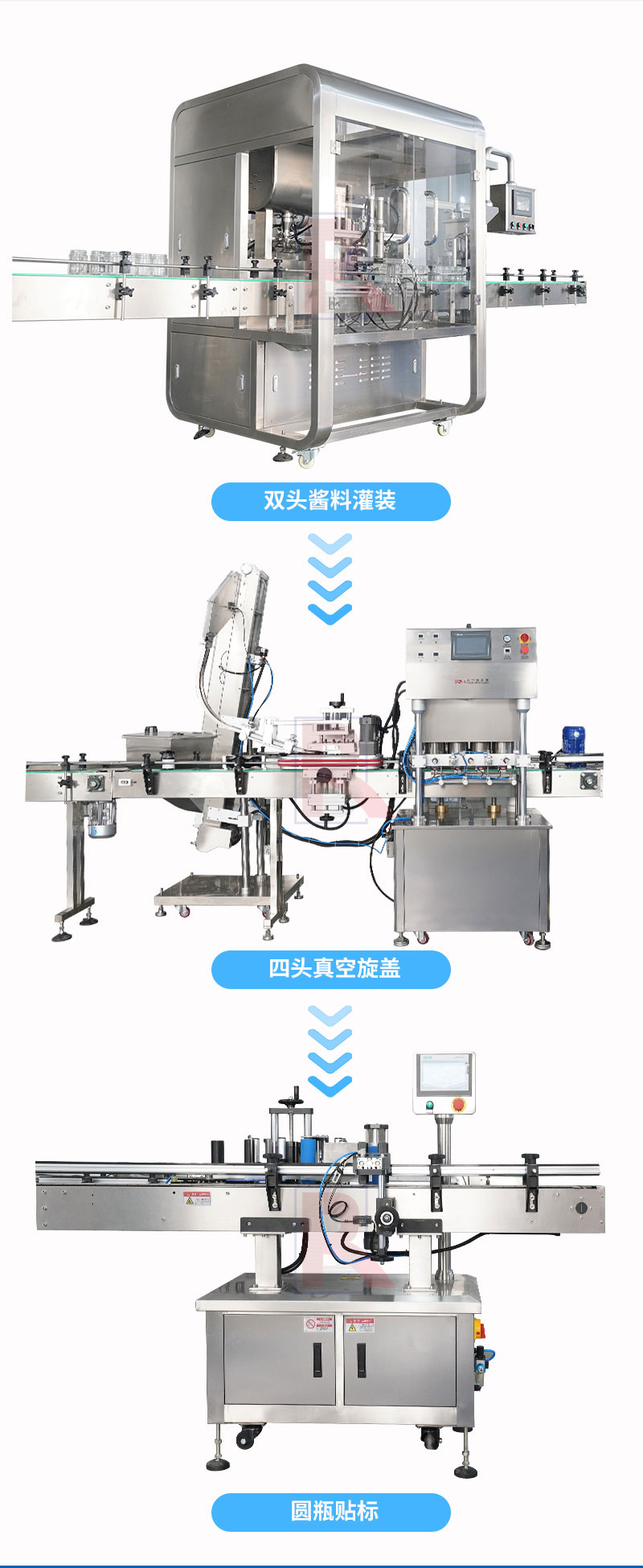 雙頭辣椒醬灌裝生產(chǎn)線適用于調(diào)味品中帶顆粒并且濃度較大的香菇醬、豆瓣醬、花生醬、芝麻醬、果醬、牛油火鍋底料等醬類的灌裝。