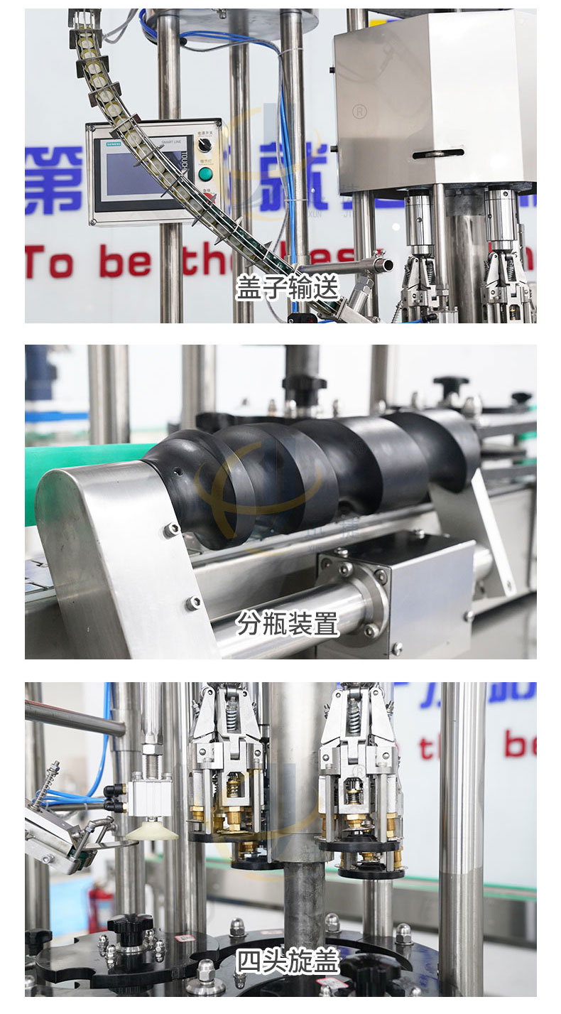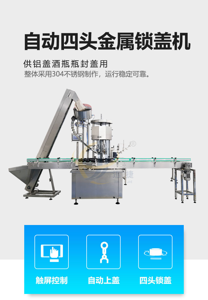 全自動(dòng)四頭金屬鎖蓋機(jī)供鋁蓋酒瓶瓶封蓋用,整體采用304不銹鋼制作,運(yùn)行穩(wěn)定可靠。適用于50-100ml各類(lèi)圓瓶、方瓶等瓶型旋蓋。