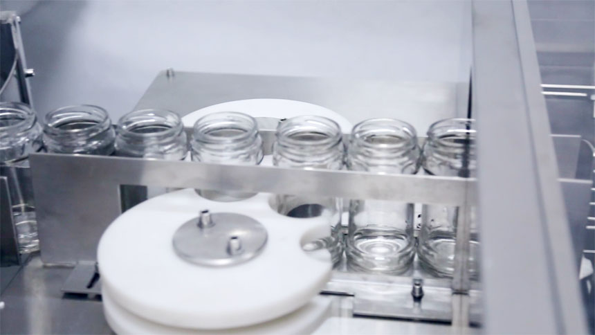 設(shè)備介紹:醬類灌裝線配套廣口玻璃瓶洗瓶機(jī)具有性能可靠、操作簡單、清洗效果良好、工作效率高等特點(diǎn),主要由不銹鋼水泵、高壓噴頭、電器箱等組成。它的工作原理是先將需要清洗的瓶子裝進(jìn)瓶盤內(nèi),然后人工送入工位,通過循環(huán)水噴將需要清洗的瓶子注滿水沉至清洗槽先進(jìn)行簡單的粗洗。然后瓶子會上升推進(jìn)洗瓶機(jī)的第二工位,在第二工位會進(jìn)行三次仔細(xì)的清洗,在經(jīng)過三次氣沖、甩干,再自動(dòng)進(jìn)入到滅菌烘箱。清洗過程為粗洗一次,仔細(xì)清洗三次,然后是烘干。