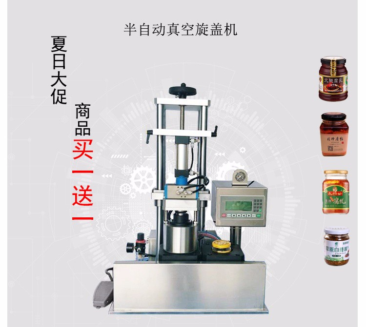 這款小型辣椒醬封口機主要用于食品包裝,采用標準馬口鐵爪式旋開蓋封口的玻璃瓶包裝。可實現(xiàn)的功能是抽吸包裝容器內(nèi)的空氣使其達到設(shè)定的負壓值(即抽真空),然后旋緊蓋子。 為半自動機型,即人工進出瓶,人工配蓋,其他過程自動。