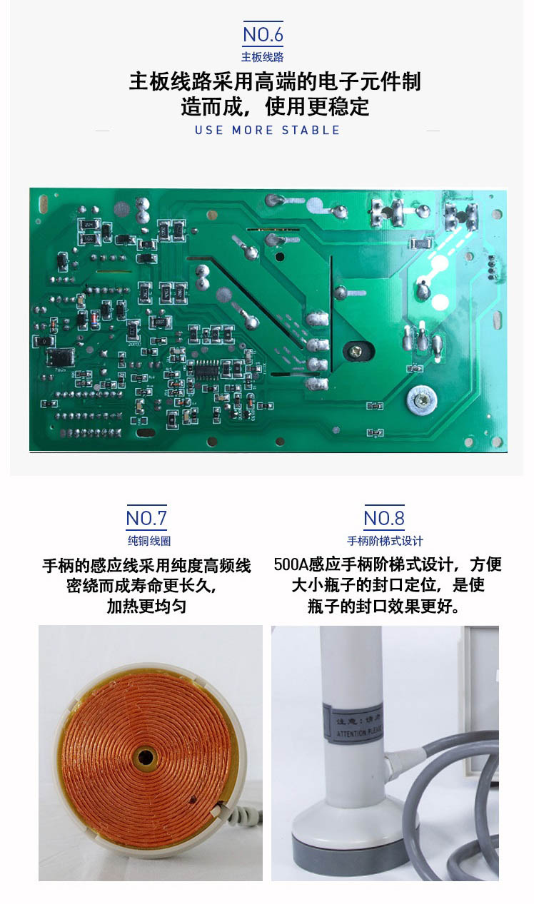 本機(jī)采用國(guó)外先進(jìn)線(xiàn)路,選用日本新模塊化功率器件,較于一般電子感應(yīng)加熱器更省電,熱效率達(dá)到90%以上,瞬時(shí)加熱速度為后者的20-30倍,因此不僅 適用于熱封性能較好的聚乙烯、聚丙烯材質(zhì)的瓶體,而且對(duì)熱封性能較差的聚酯瓶、玻璃瓶也有極好的封口效果。